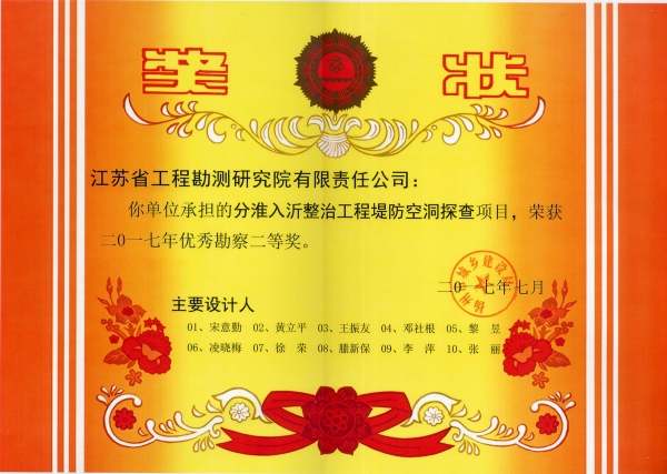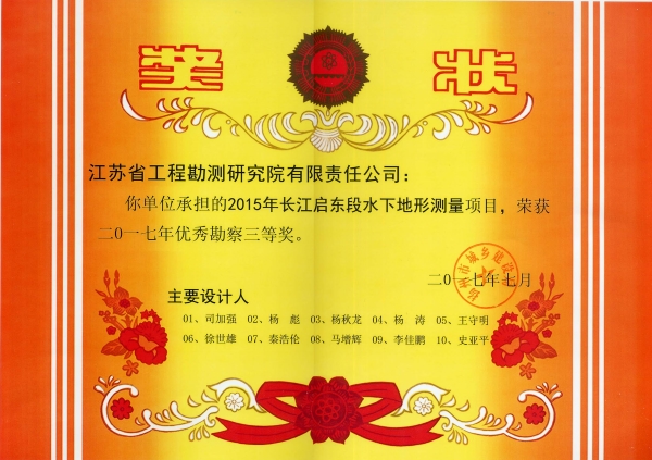 近日,扬州市城乡建设局公布2017年市优秀勘察设计奖评选结果,我华体网站登陆入口有三个工程项目获市级优秀工程勘察奖。获奖的工程项目分别是“扬州市城市抗震防灾规划工程地质勘察”项目荣获优秀勘察一等奖,“分淮入沂整治工程堤防空洞探查”项目和“2015年长江启东段水下地形测量”项目分别获得优秀勘察二等奖和三等奖。